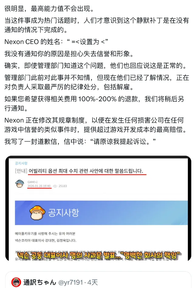 Nexon表示我们再次为我们的错误致歉。对于选择退款的玩家,我们感谢您过去的支持;对于选择留下的玩家,我们将努力重建信任。