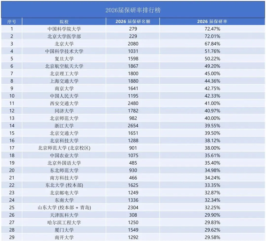 中国科学技术大学的保研人数下降,与2025届相比减少了近百人,保研率下降4.18%。