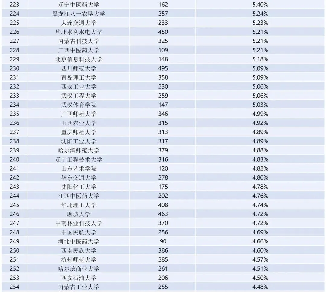 与2025届相比,华南理工大学的保研增长人数最多(333人,保研率增加4.09%);其次是青岛科技大学(保研人数增长292人,保研率增加4.05%);西南交通大学紧随其后(保研人数增长了154人,保研率增加了1.85%)。