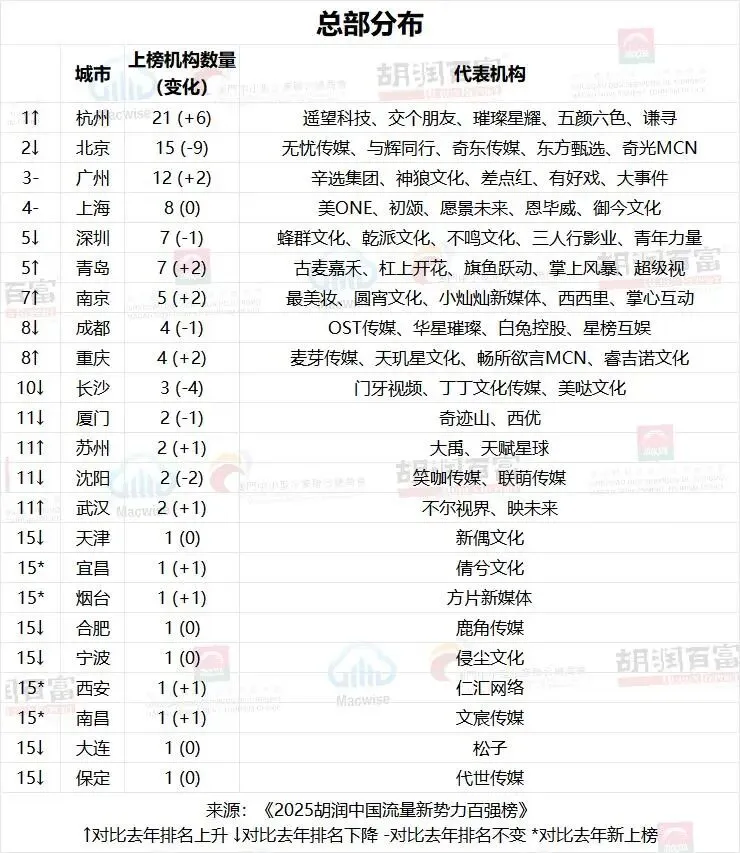 《2025 胡润中国流量新势力百强榜》上榜机构平均拥有 2.8 亿粉丝,平均签约达人 530 人。此次新上榜机构 34 家。同时有 20 家机构落榜,主要原因包括机构解散、核心达人离开等。百强机构分布于 23 个城市,其中七成位于杭州、北京、广州、上海、深圳、青岛这六大城市。有 4 家上榜机构的母公司为上市公司。
