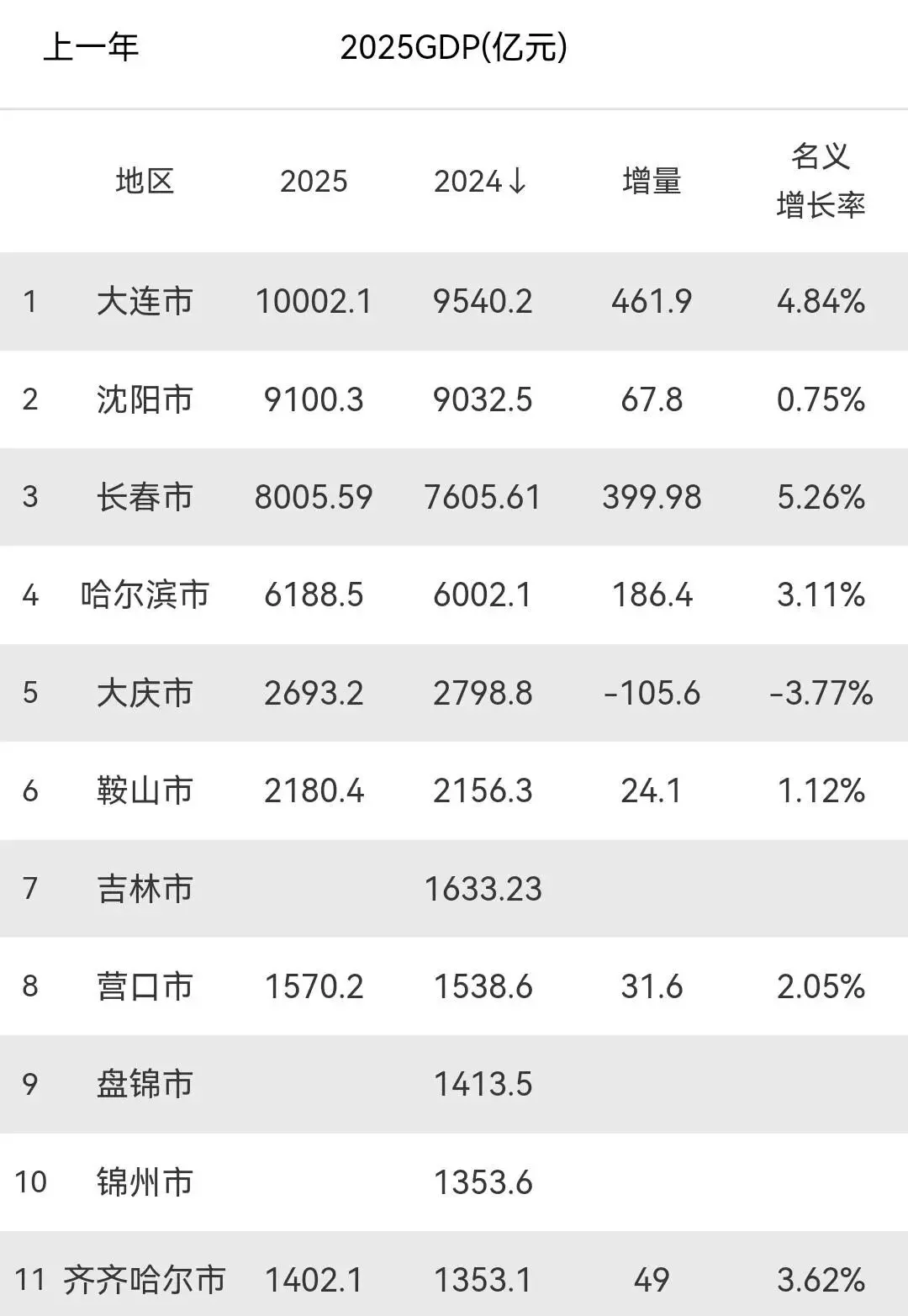前十的后半段,营口表现不错,GDP1570.2亿,增量31.6亿,增速2.05%,排名第八。营口的港口物流和轻工业挺活跃,是东北小城的典范。但吉林市、盘锦和锦州的数据就有点模糊了——吉林2024年GDP1633.23亿,盘锦1413.5亿,锦州1353.6亿,2025年数据还没公布,这给前十排名蒙上了阴影。齐齐哈尔倒是公布了,GDP1402.1亿,增量49亿,增速3.62%,排名第十一,但锦州如果2025年数据出来,可能比它高,齐齐哈尔能否挤进前十还是个问号。这种不确定性提醒我们,东北经济格局还在动态调整中,小城市间的竞争激烈得很。
