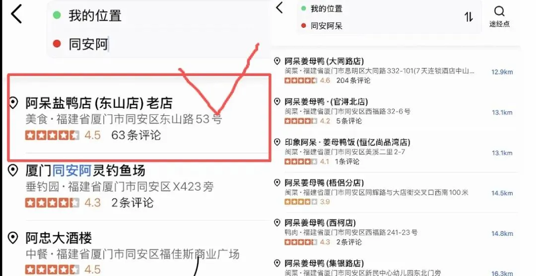 你导航如果输入“同安阿呆”会跳出另外一家连锁阿呆,这家老店你要输入“同安阿”,就会跳出“阿呆盐鸭店(东山路)老店”。看下图