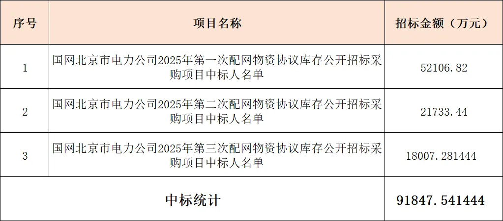 中标排名 | 国网北京市电力公司2025年配网物资协议库存中标名单发布!