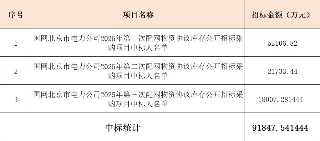 国网北京市电力公司今年3次配网物资协议库存招标金额共计9.18亿。本期内容,中标之家整理了上述物资协议库存招标的中标企业名单,按中标金额排名如下:共140家企业中标:
