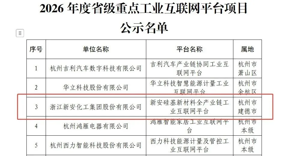 近日,2025年度浙江省高新技术企业创新能力500强榜单出炉,浙江新安化工集团股份有限公司(以下简称“新安股份”)上榜!与此同时,浙江省经济和信息化厅公布了2026年度省级重点工业互联网平台项目名单,全省仅20家企业平台入选,其中新安股份打造的“新安硅基新材料全产业链工业互联网平台”位列其中,为建德数字经济发展注入了新动能。