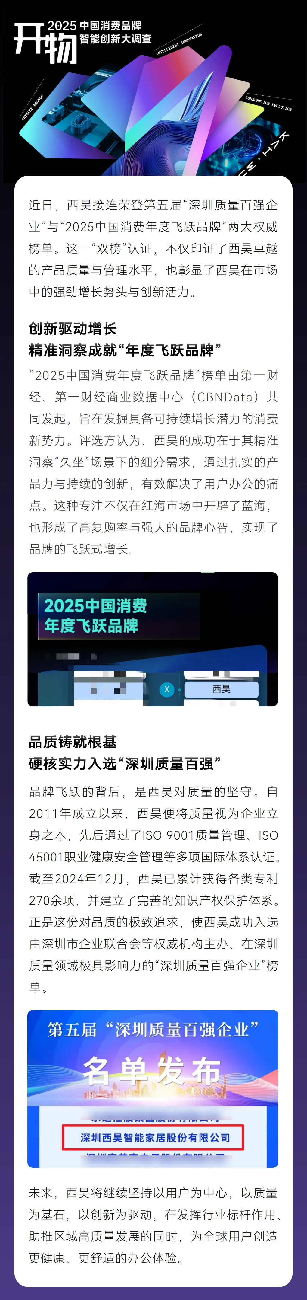 >西昊荣登第五届“深圳质量百强企业”与“2025中国消费年度飞跃品牌”两大榜单