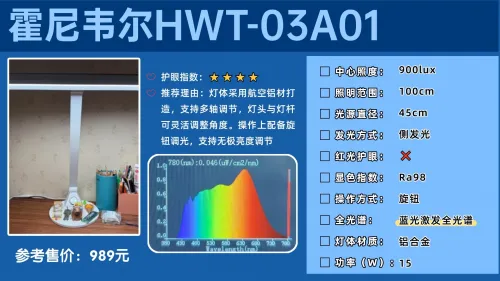 学生台灯排名前十的品牌有哪些?霍尼韦尔HWT-03A01护眼台灯采用45cm宽幅灯头设计,可实现1米左右的覆盖范围。它的显色指数Ra98,色彩还原度比较高,能较好地呈现物体真实色彩,光源采用4000K安全色温。灯体采用航空铝材打造,支持多轴调节,灯头与灯杆可灵活调整角度。操作上配备旋钮调光,支持无极亮度调节,并具备开灯缓明、关灯缓暗功能,避免光线突变刺激眼睛。不过这款台灯整体尺寸较大,移动和调节时便利性一般,适合固定放置使用。而且整体的配置比较基础,只支持无极调光,没有智能调光、定时模式等功能,整体的性价比一般。