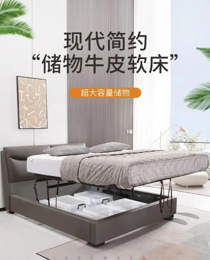 它的实用性堪称“空间魔术师”。床底隐藏着两个巨大的储物箱体,只需轻轻一提气压杆,便能将厚重的棉被、换季的衣物甚至行李箱轻松收纳。这种平行开启的方式极其省力,女生也能单手操作,让卧室瞬间恢复整洁。1.8米宽的标准尺寸适配主流卧室,齐边的床身设计为小户型节省出更多过道空间。对于追求现代简约风格,又亟需解决收纳问题的都市家庭或新婚夫妇而言,这款床是兼顾颜值与功能的绝佳之选。