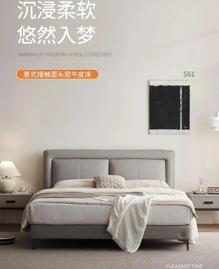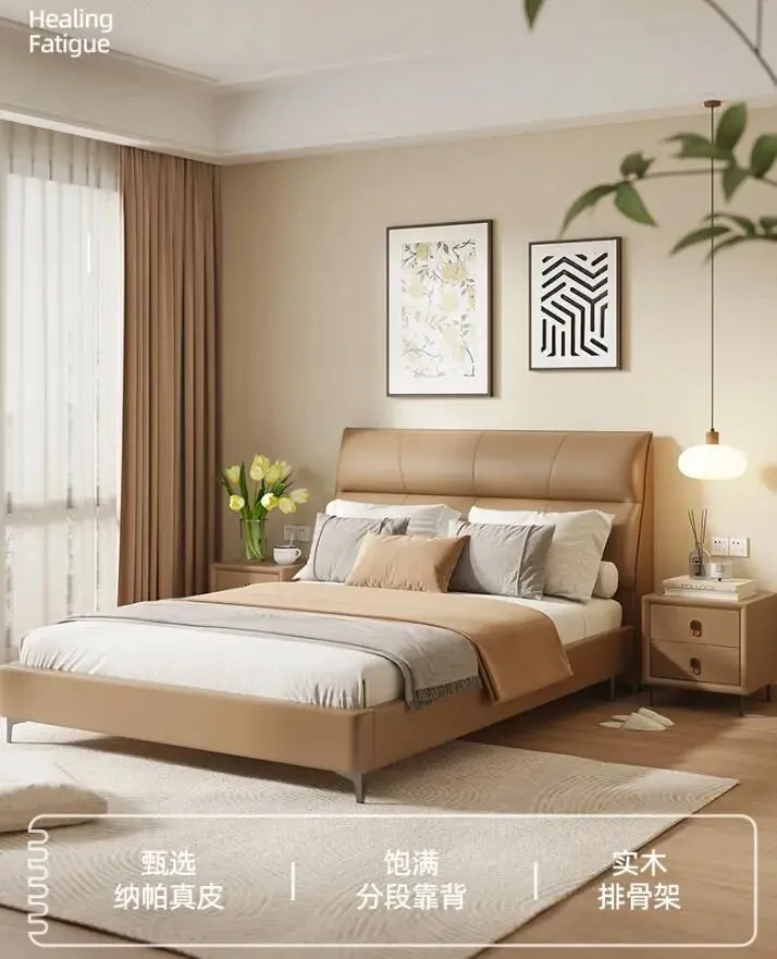 当实木的温润扎实遇上真皮的柔软细腻,便诞生了大自然S61这样一款让人心安的作品。它选用优质实木作为核心骨架,从根源上保证了床体的稳固与耐用,木材天然的纹理透露出原始的生命力,这是任何人工板材都无法比拟的质感。在此基础上,床体贴心地包裹了触感上乘的真皮软包,尤其在床头区域,厚实的填充让靠卧体验极度舒适,实现了视觉温度与身体触感的双重享受。