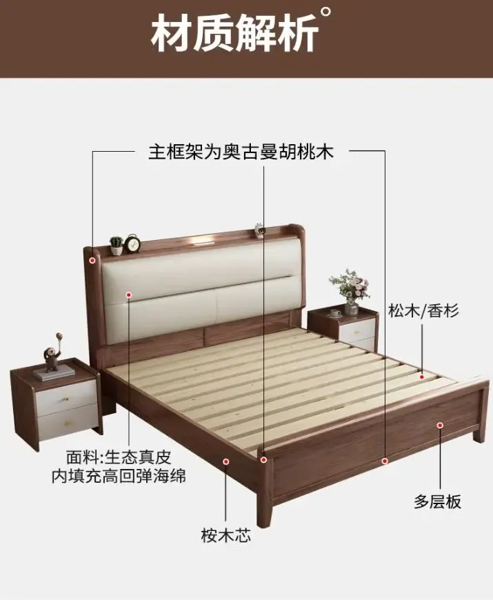 师梵509#实木床完美诠释了何谓“现代东方气质”。它甄选纹理优美、质地坚硬的胡桃木,木色深邃温润,随着时间流逝会沉淀出愈发迷人的光泽。与全实木的冷硬感不同,它在床头创新地加入了软包设计,采用环保亲肤的布料或皮革,将倚靠的舒适性与实木的质感美结合得天衣无缝。这种设计既保留了实木家具的温度与底蕴,又照顾到了日常使用的实际舒适度,睡前靠着读一会儿书,成为一种享受。