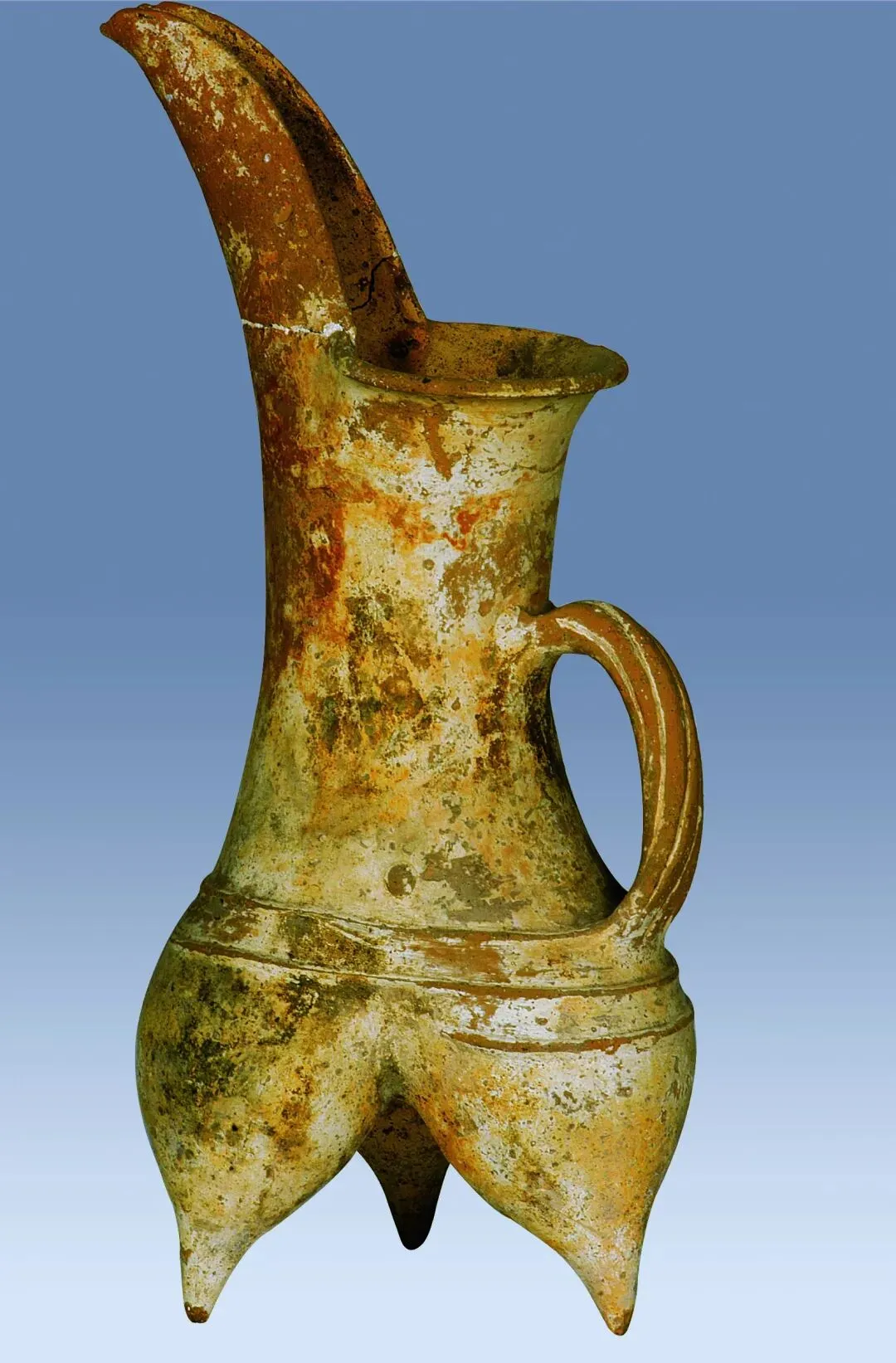 龙山文化陶鬶,1964年秋角楼村断崖出土。高41厘米,夹砂红陶,通体施白衣,斜长流,口沿外翻,长粗颈,绳索状把手,腹部饰弦纹3周,对称贴塑小圆饼2个,3袋足。