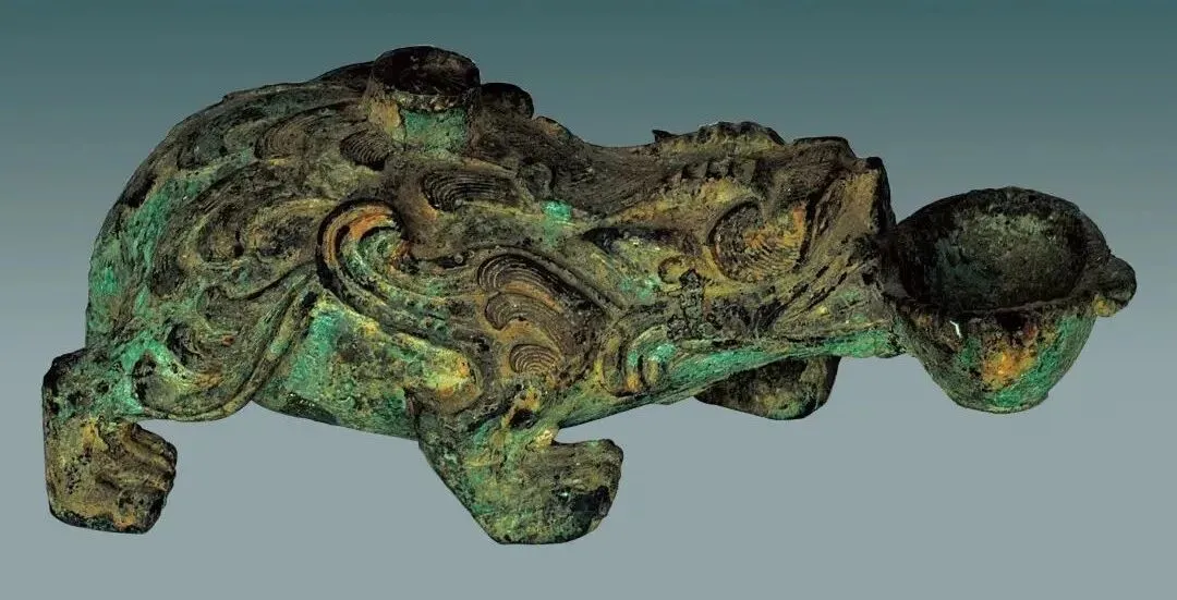 汉兽形铜水滴,长16厘米、通高6厘米,重787克。作四足着地爬行的兽状,口衔一耳杯,蒜头形鼻,双眼注视前方,大嘴、双耳、双角、双须,铸造精细,造型奇特。