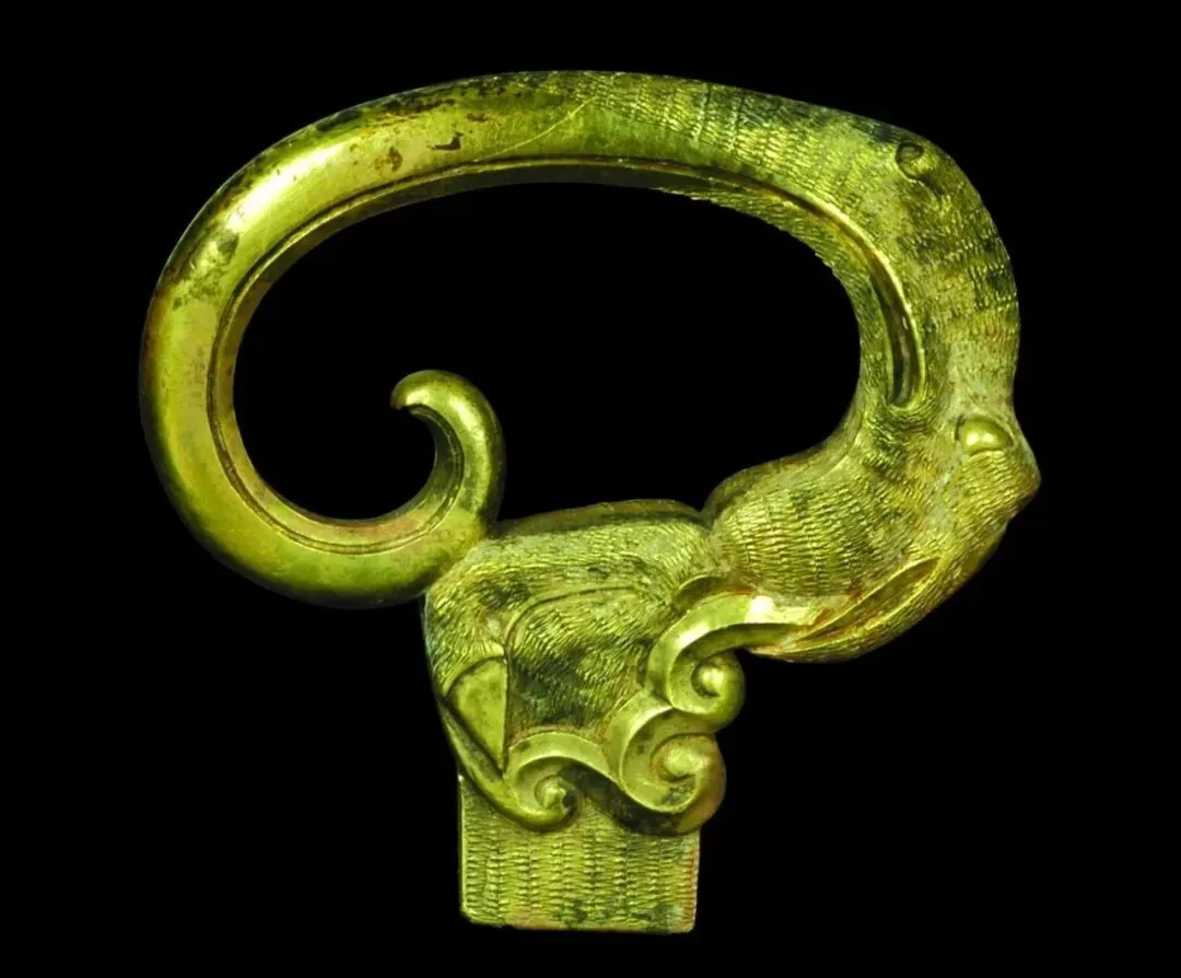 战国金环首,高5.6厘米、宽5.4厘米。2004年西辛战国古墓出土。整体略呈椭圆形,为卷曲成环的异兽形象,该异兽形象与草原文化流行的神兽格里芬颇为相似。