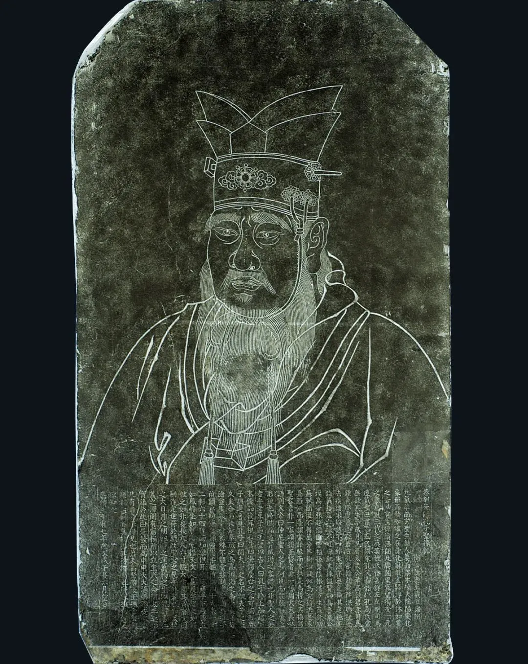 明孔子像石刻,高142厘米、宽79厘米。线刻,画面为孔子像的上半身,像高84厘米。石刻的下部有约600字的撰文,字径2.5厘米,是明衡王的孙子——新乐王朱载玺于嘉靖三十七年所作。