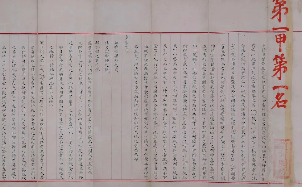 明万历二十六年(1598年)状元赵秉忠殿试卷,通高47.6厘米,每折宽14.1厘米,天头8.6厘米,地脚3.3厘米,中间行文高35.7厘米。三层宣纸装裱,封面、封底系全绫装裱。
