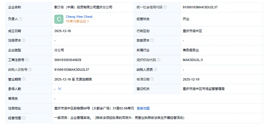 近日,世界500强企业默沙东在重庆市渝中区完成工商注册登记,设立默沙东(中国)投资有限公司重庆分公司。