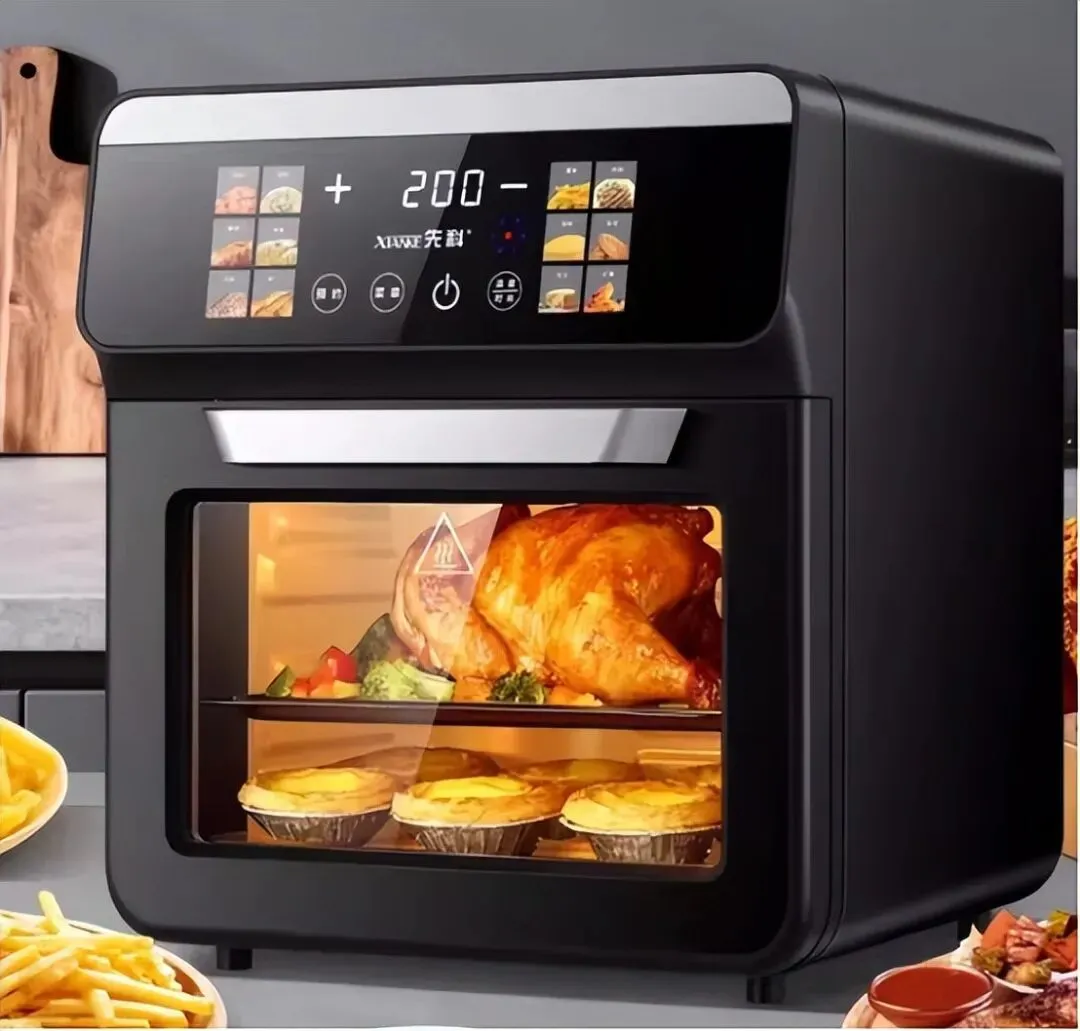 操作面板采用触控式设计,搭配清晰的显示屏,可实时查看烹饪时间和温度,操作便捷;能正常完成各类食材的烹饪,热风循环基本稳定,无过度油烟释放,满足日常多样化的烹饪需求。