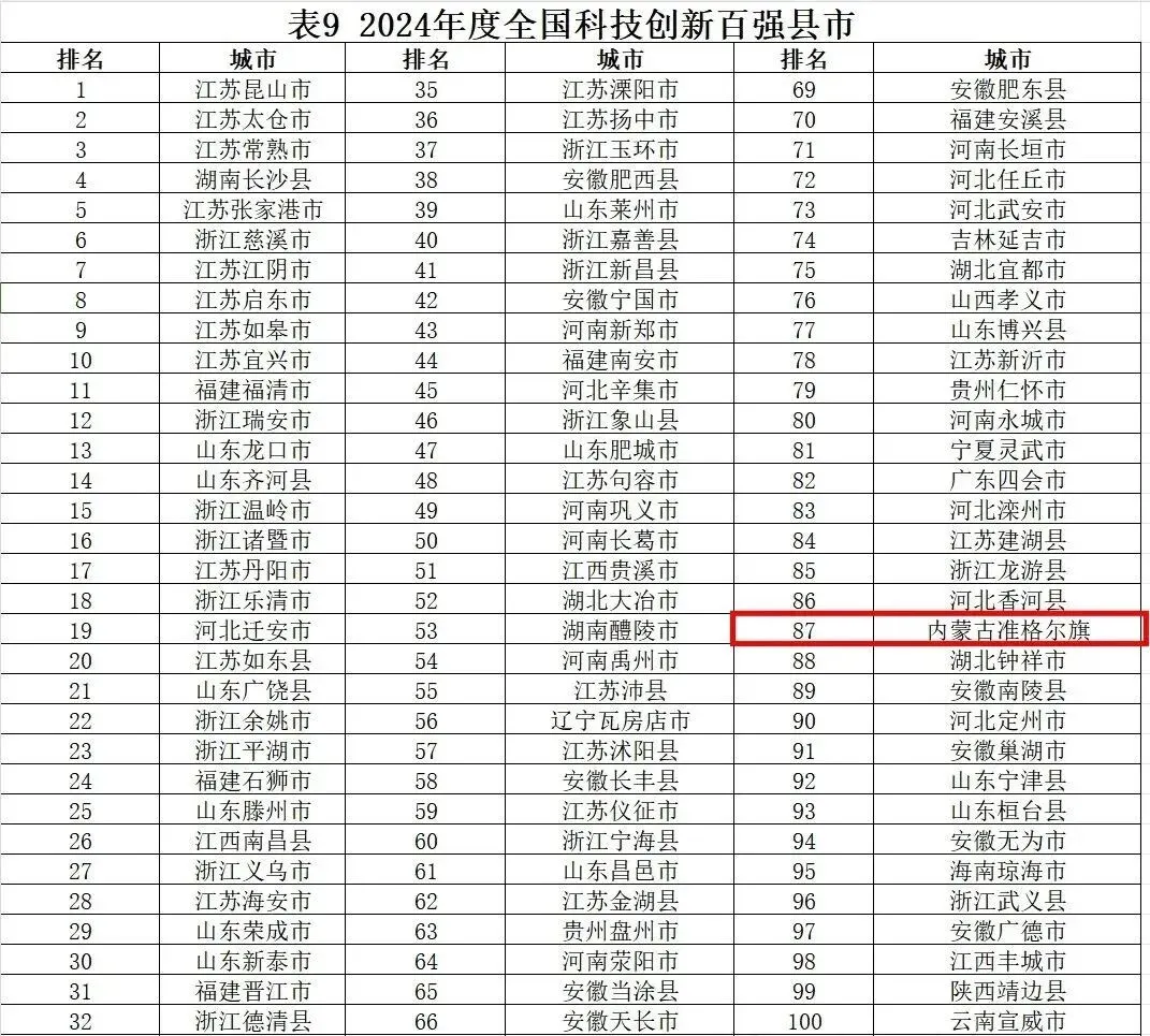 9月20日,中国中小城市发展指数研究课题组、国信中小城市指数研究院在《光明日报》权威发布《2024年中国中小城市高质量发展指数研究成果》。准格尔旗荣登2024年度全国科技创新百强县市榜单,全区唯一上榜!