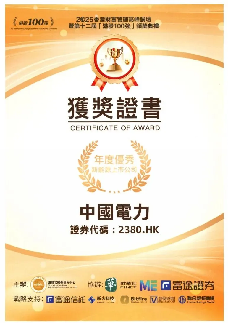 近日,在2025香港财富管理高峰论坛暨第十二届“港股100强”颁奖典礼上,中国电力荣获“年度优秀新能源上市公司”大奖。