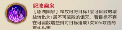 二技能【怨浊幽泉】:星图总等级64级解锁,[怨浊幽泉]释放时将目标1层可驱散的增益转化为1层不可驱散的诅咒,若目标不存在可驱散增益则对目标造成1次30%攻击的真实伤害。
