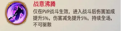 三技能【战意沸腾】:星图总等级96级解锁,仅在PVP战斗生效,进入战斗后伤害加成提升5%,伤害减免提升5%,持续全场,不可驱散。