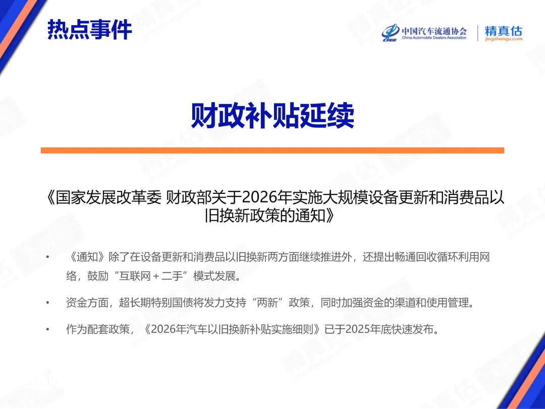 汽车以旧换新对于消费的拉动作用非常显著。在2025年底至2026年1月期间,一些地区补贴暂停成为了影响新车销量的因素之一。本次财政继续发力,为2026年车市增加了“确定性”。根据《细则》,补贴金额与购买的新车价格挂钩,有助于促进消费升级。文件还指明“转让的乘用车旧车,应当于2025年1月8日前登记在申请人名下”。监管方面,“全国汽车以旧换新平台”成为重要的数据汇总和审核平台。