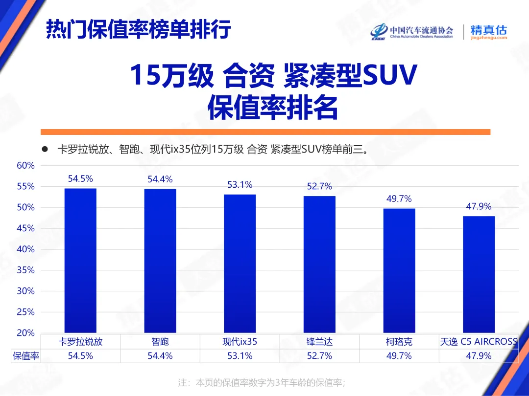 在15万级合资紧凑型SUV这一“务实主义”的消费主战场,市场对于高可靠性、低用车成本的核心诉求依旧强烈。丰田卡罗拉锐放凭借其深入人心的品牌口碑与均衡无短板的产品力,以54.5%的三年保值率位居榜首,再次印证了“丰田品质”在主流家用市场中的强大号召力。起亚智跑与现代ix35分别位列保值率第二、第三名。