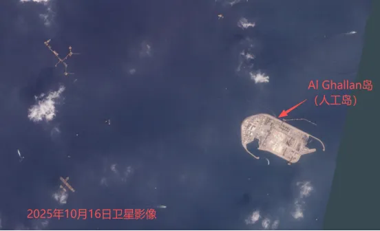 下扎库姆油田海上设施及Al Ghallan岛卫星影像(2025年10月16日)