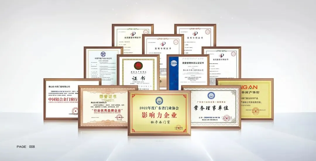 十六载匠心坚守,荣誉见证实力。杜卡西门窗凭借卓越的产品力与创新力,斩获“门窗十大品牌”“行业优秀品牌企业”等多项殊荣,成为高端门窗领域的标杆品牌。