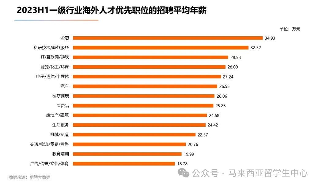 在留学生担任的职位里,金融是平均薪资最高的行业,平均年薪达34.93万元;其次是科研技术/商务服务领域,平均年薪为32.32万元;IT/互联网/游戏位列第三,平均年薪为28.58万元。