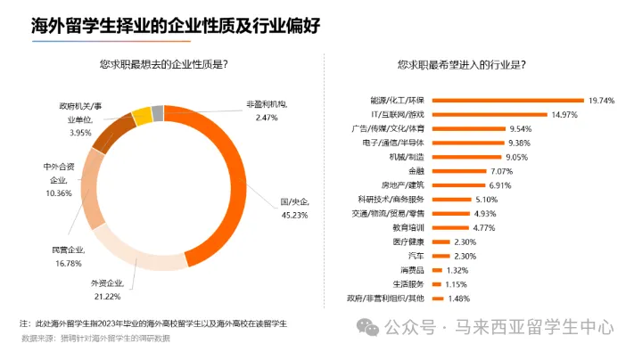 对于企业偏好,留学生更喜欢希望进入国企/央企等“铁饭碗”,占比为45.23%。马来西亚许多专业对于考公考编都有优势,而且对于入编,许多机关单位有海归人才政策,比如毕业QS排名200以内(理科大学第137名、博特拉大学第158名等等)或者QS排名100以内(马来亚大学第65名)的院校免笔试等政策。