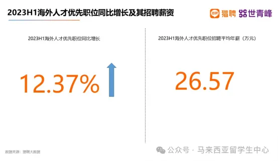 该指标为“会优先考虑招生留学生”的岗位,其中优先岗位比以往增长了12.37%,增长岗位中的平均年薪也很可观,达到了26.57万元。作为留学生的优势就体现出来了,很多岗位比如金融、IT等,更多的HR愿意优先考虑海外人员,说明留学生更具备这方面的知识和能力。