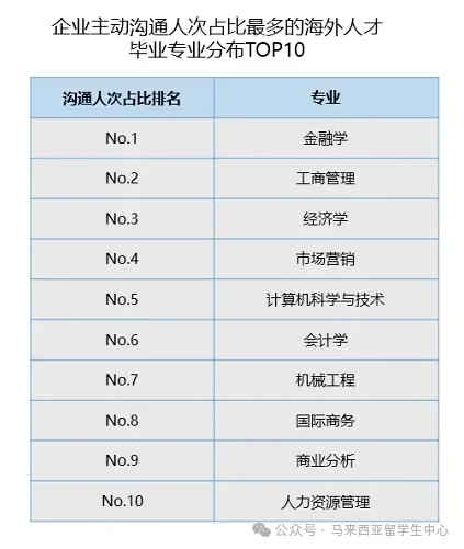 企业主动沟通最多的三个专业分别为金融学、工商管理和经济学专业。都是商科类的专业,现在想去马来西亚留学的小伙伴都知道选择什么专业更有就业前景了吧!