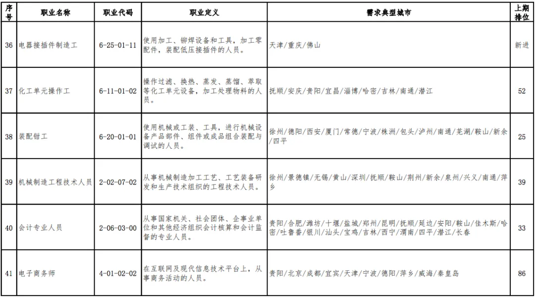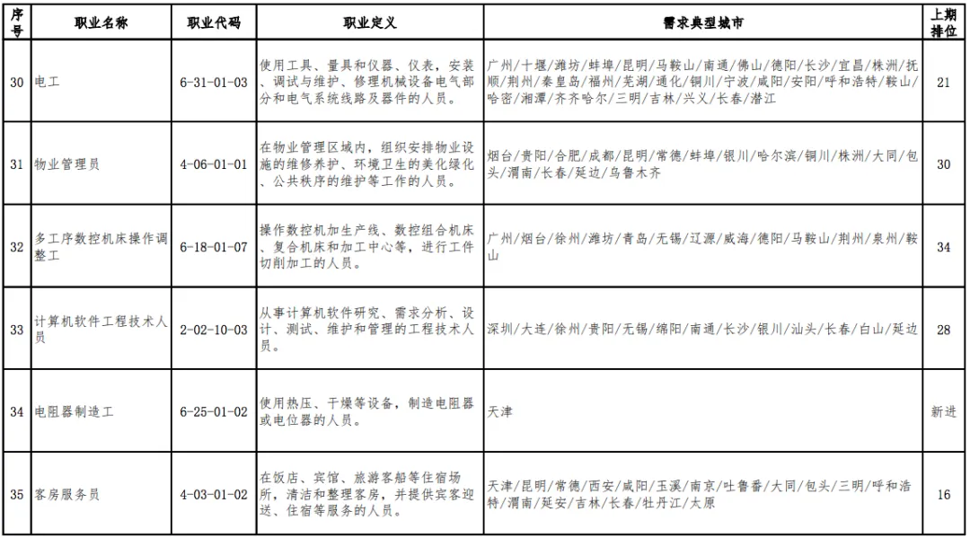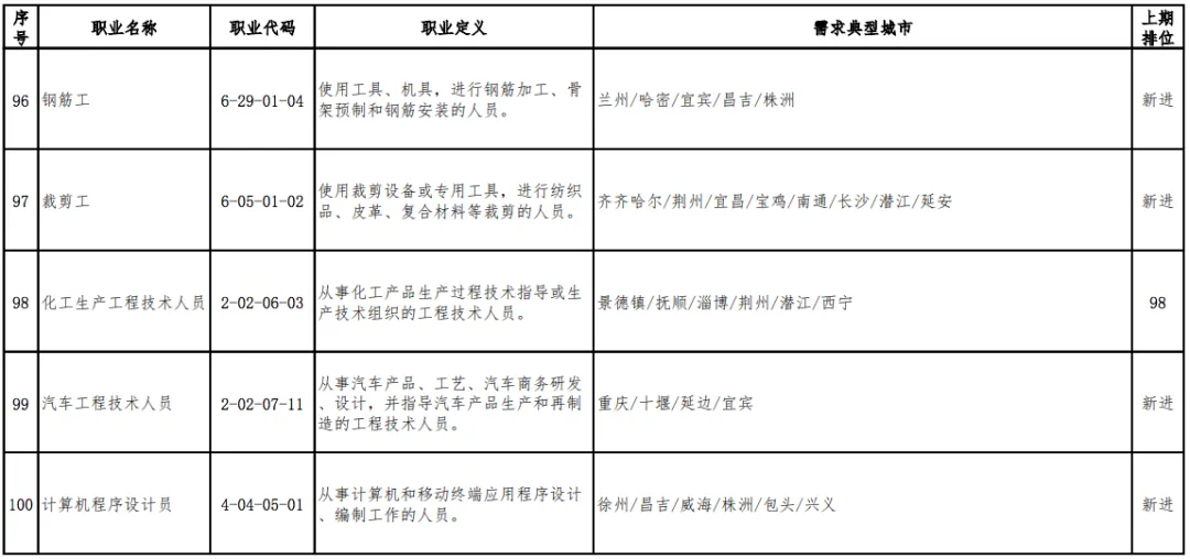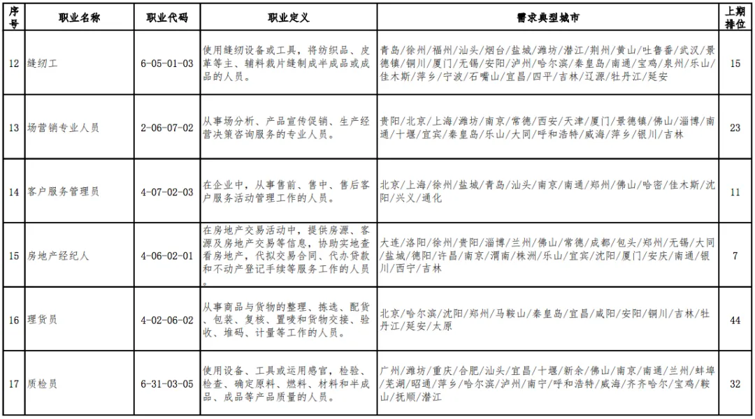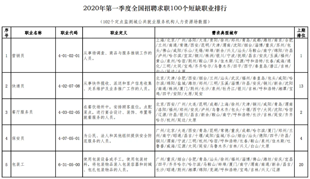 党的机关、国家机关、群众团体和社会组织、企事业单位负责人(2个)具体而言,短缺职业排名前十名的职业是营销员、快递员、餐厅服务员、保安员、包装工、焊工、保洁员、商品营业员、装卸搬运工、车工。