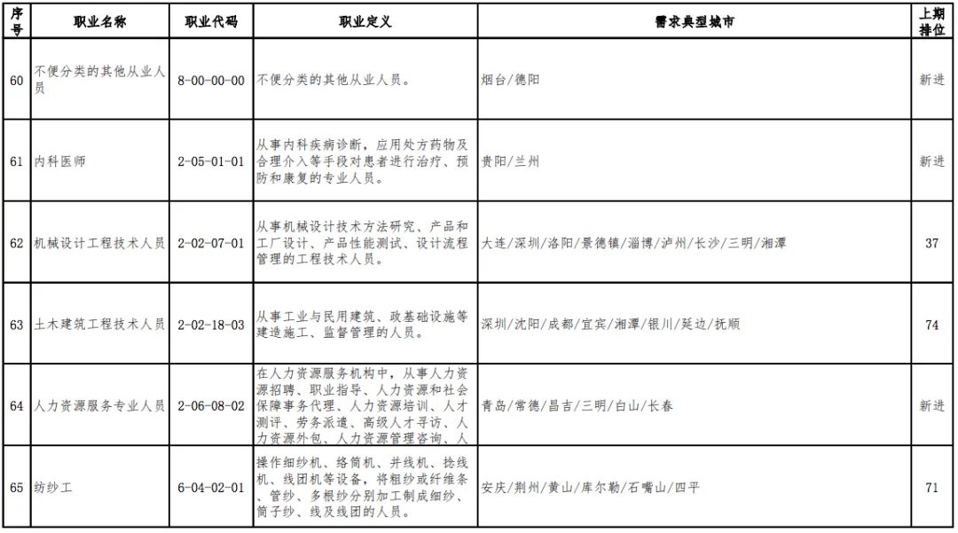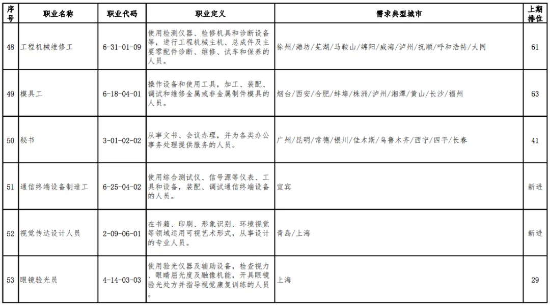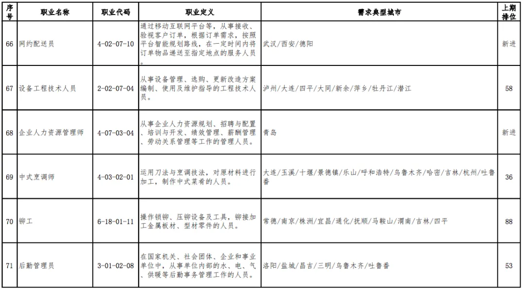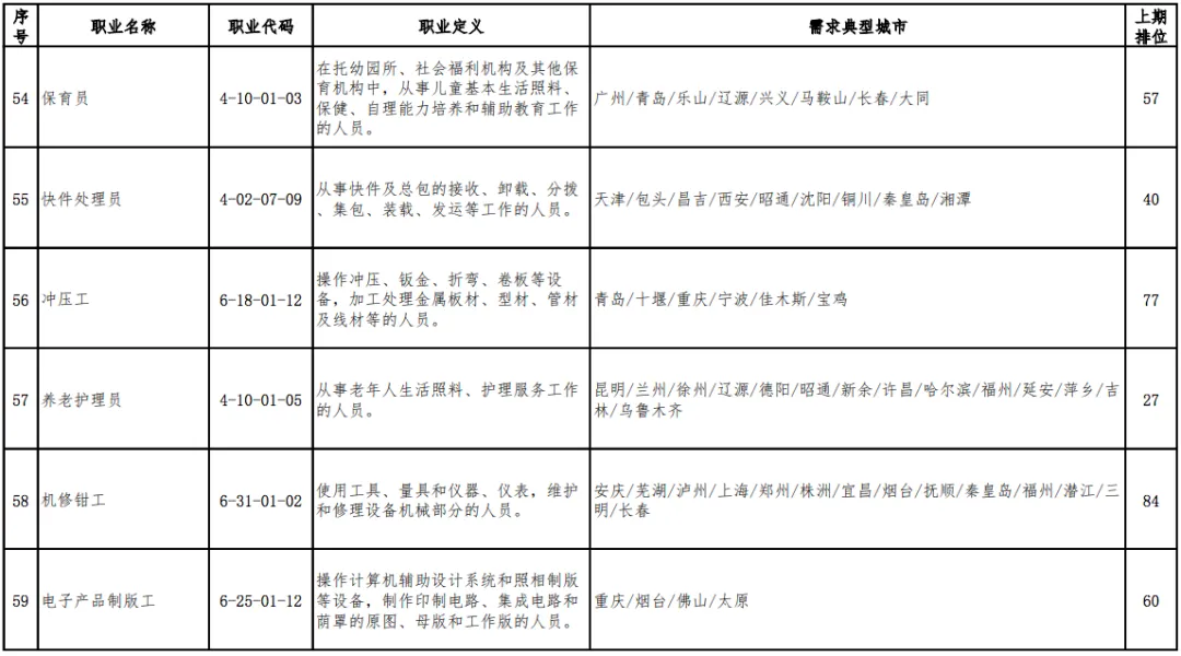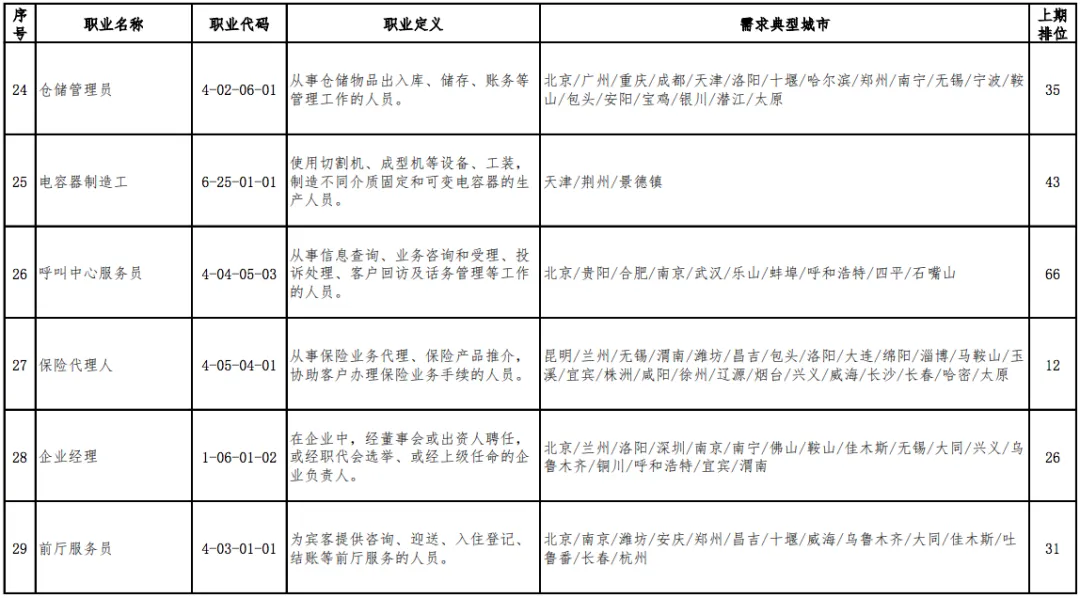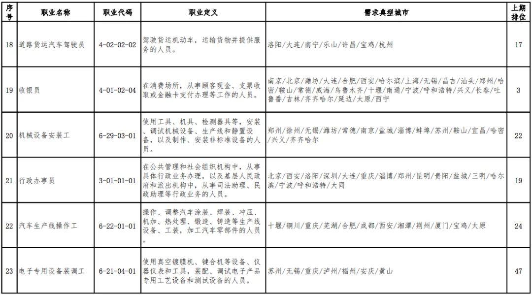 值得一提的是,“营销员”连续三期稳居第1位,“快递员”由上期(2019年第四季度)第13位跃居本期排行第2位,本期“家政服务员”“房地产经纪人”“收银员”等3个职业退出前十。