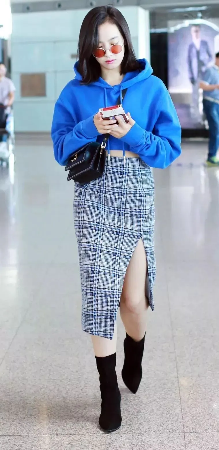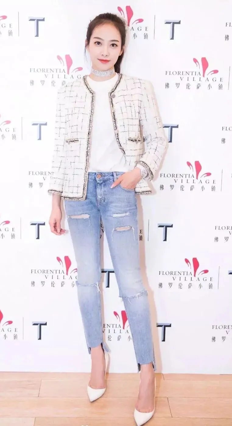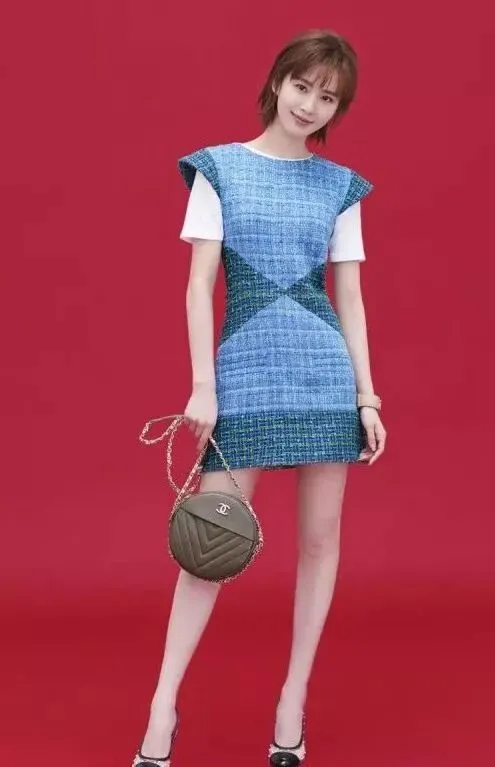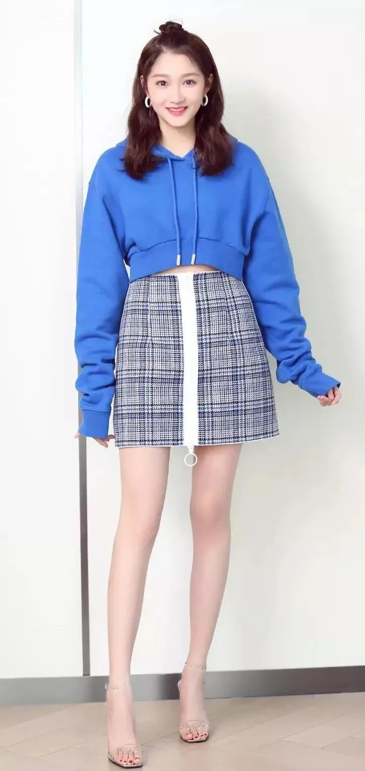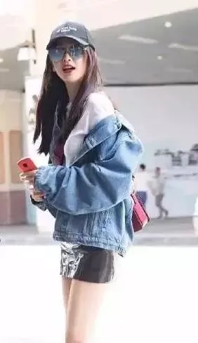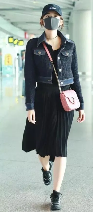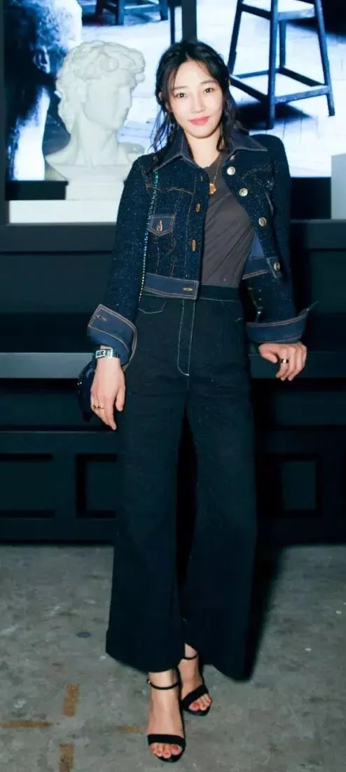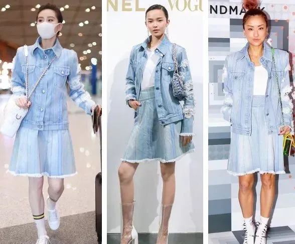 牛仔套装的三人演绎,只有雎晓雯穿出了高级时尚感,另外两个人都略显普通,毕竟这个长度的半裙不是显腿短就是显腿粗。