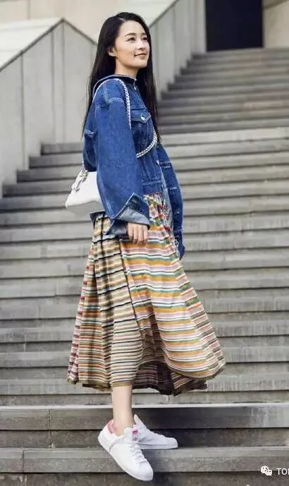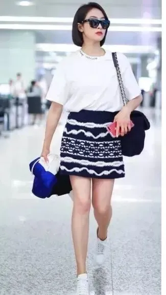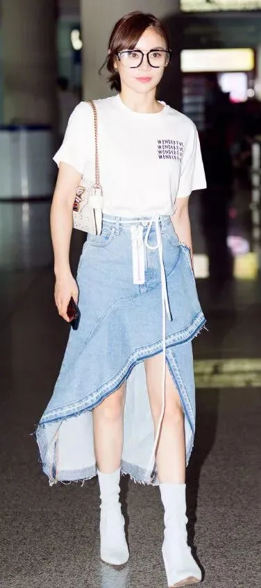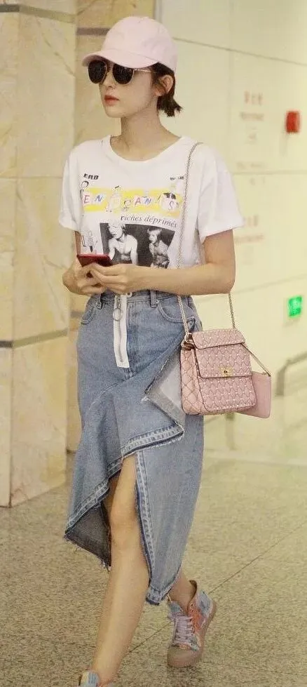 刘诗诗在套裙内里搭配白T显得更有层次感,也更加展现出了和林允不同的个性。手拿的小圆包也比普通肩挎包提升了好几个Level的时尚度。(以下大家会持续看到刘诗诗高能)