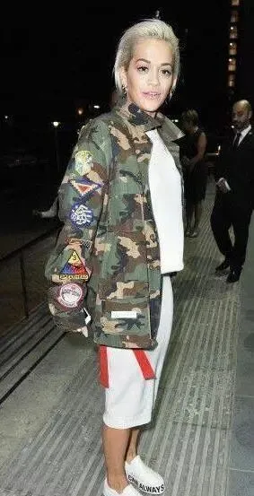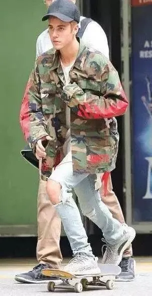 女星瑞塔·奥拉身穿这件迷彩服诠释中性帅气,加拿大潮王比伯则化身滑板男孩,但是我们的天宝同学却好像有点像去军训的样子(捂脸)