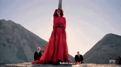 正如上图来自《美国恐怖故事-女巫集会》Gif是讲巫师理事会的Myrtle Snow女巫在被执行火刑临死前,超级女巫问她有什么想说的话吗,她高喊:“Balenciaga”