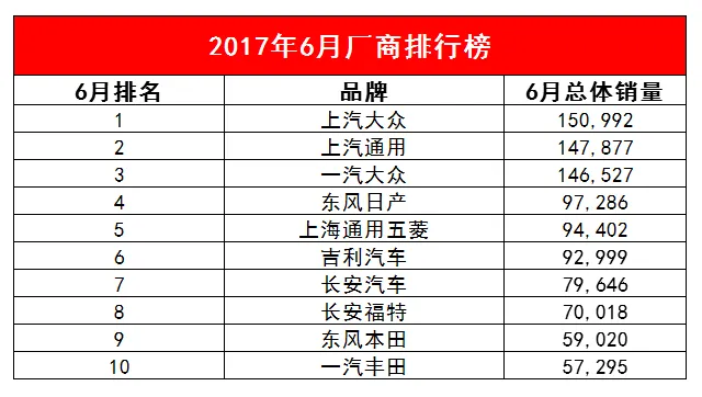 六月份上汽大众、上汽通用和一汽大众依旧为汽车行业前三甲,东风日产、吉利汽车、长安汽车、长安福特月度销量均出现高增长态势,同时也是榜单的常客,而上海通用五菱6月销量出现了下滑,而长城汽车6月份销量表现低迷,本月销量只有56,416辆,被逐出前十。