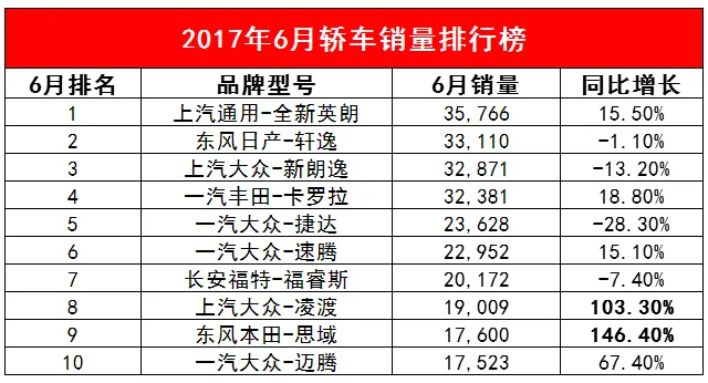 6月份轿车销量87.80万辆,同比下跌0.1%,基本与整体车市持平。英朗、轩逸和朗逸构成的第一军团可以说是稳坐前三,前十中,大众也是最大赢家,占有5个席位。