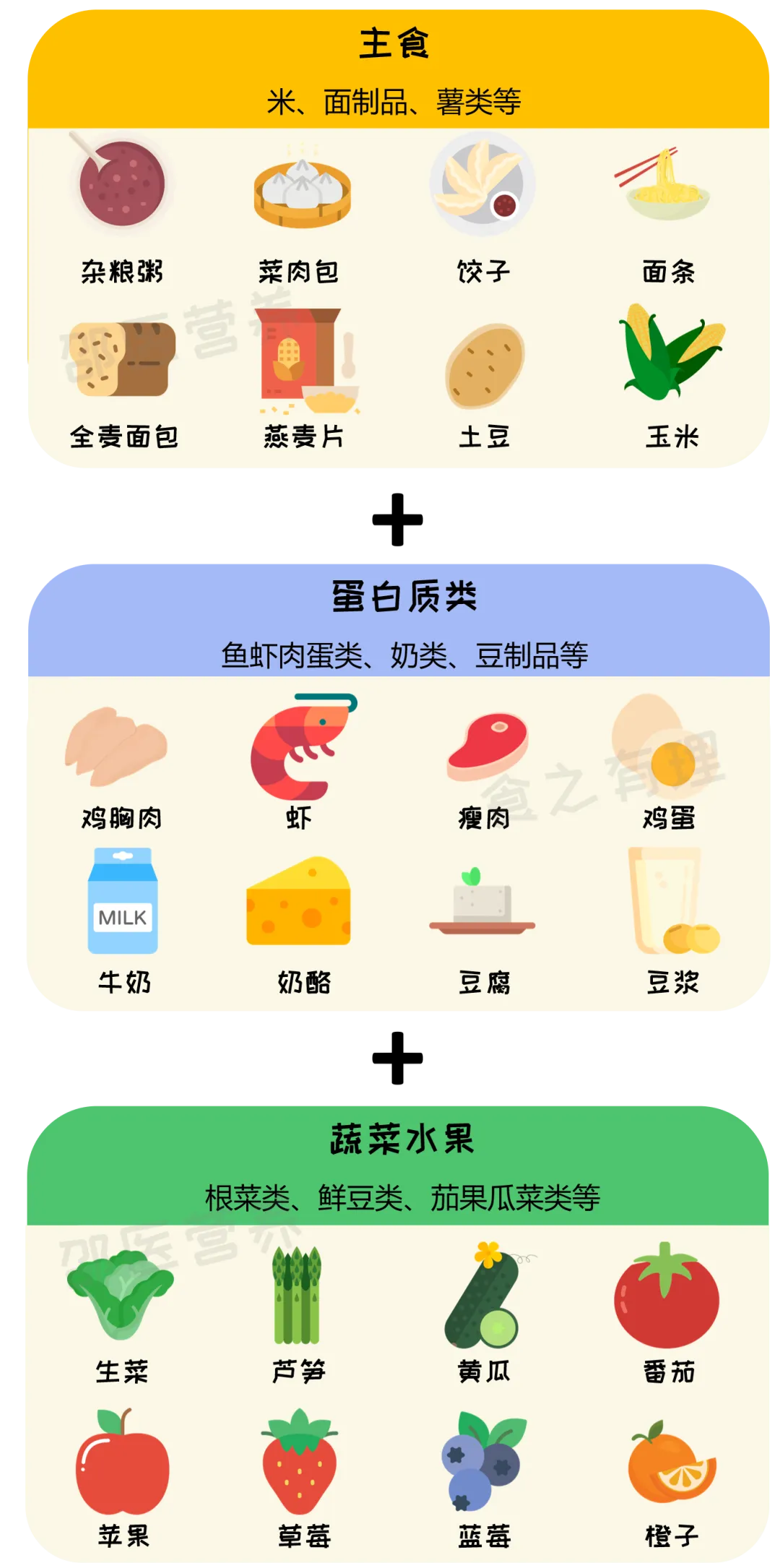 主食(有一点粗粮更好)+优质蛋白+蔬果
