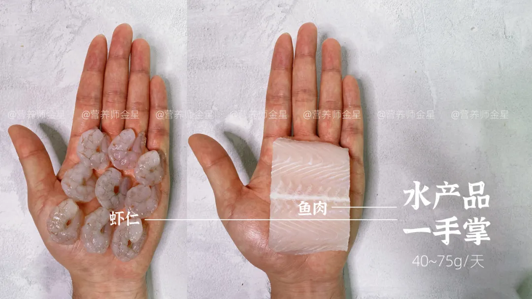 水产品和畜禽肉一样,一手掌的量是40~75g