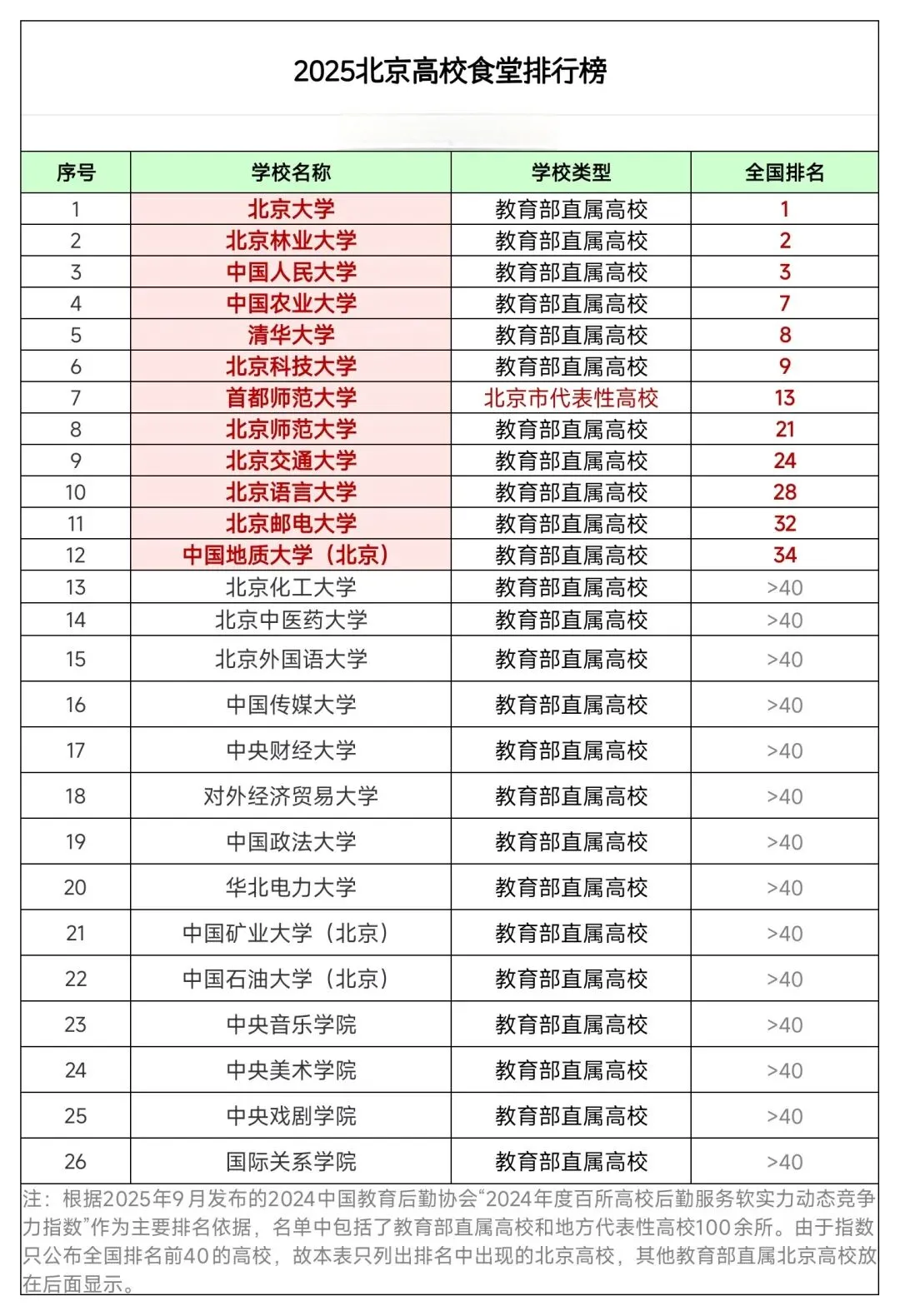 2025年9月,由中国教育后勤协会主办,北京大学协办的“2024年度百所高校后勤服务软实力动态竞争力指数”发布会在北京大学举行。北京高校排行榜正式出炉!
