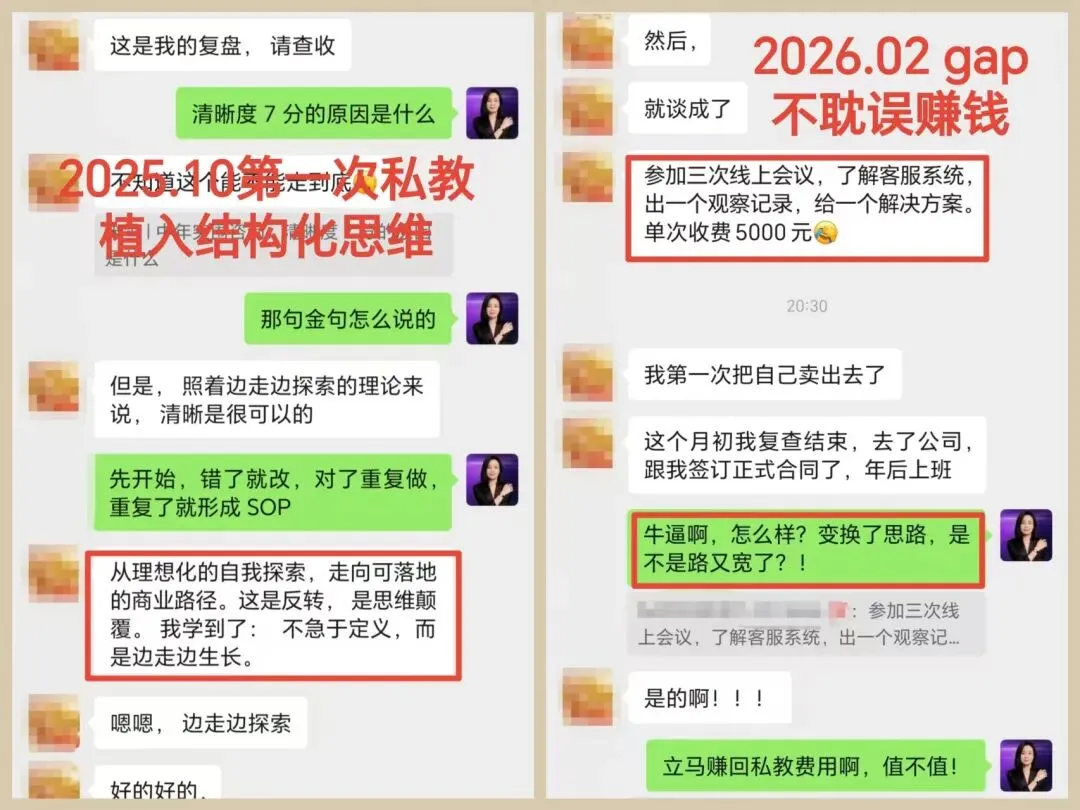 我们梳理了她的内在愿景,盘点了现有资源,设计了“最小成本试错”的副业路径。第三次对话后她突然意识到:自己原来踩在金矿上。