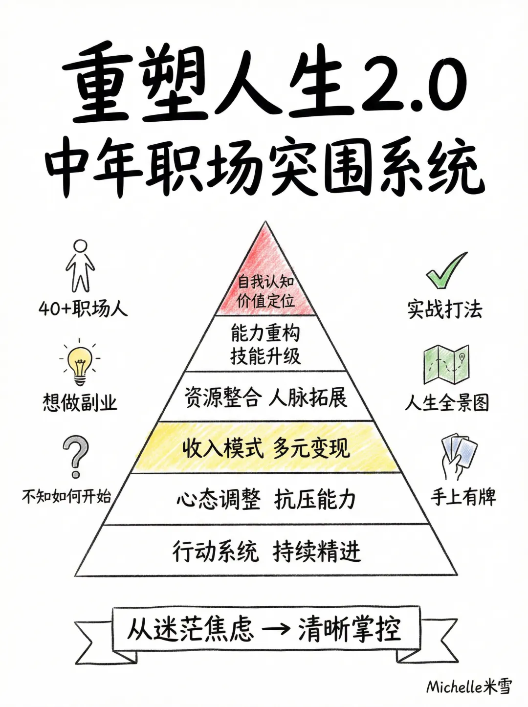 这是一套基于我 18 年职场实战和自身转型经验的系统化方法论,涵盖六大核心模块:自我认知与价值定位、能力重构与技能升级、资源整合与人脉拓展、收入模式与多元变现、心态调整与抗压能力、行动系统与持续精进。