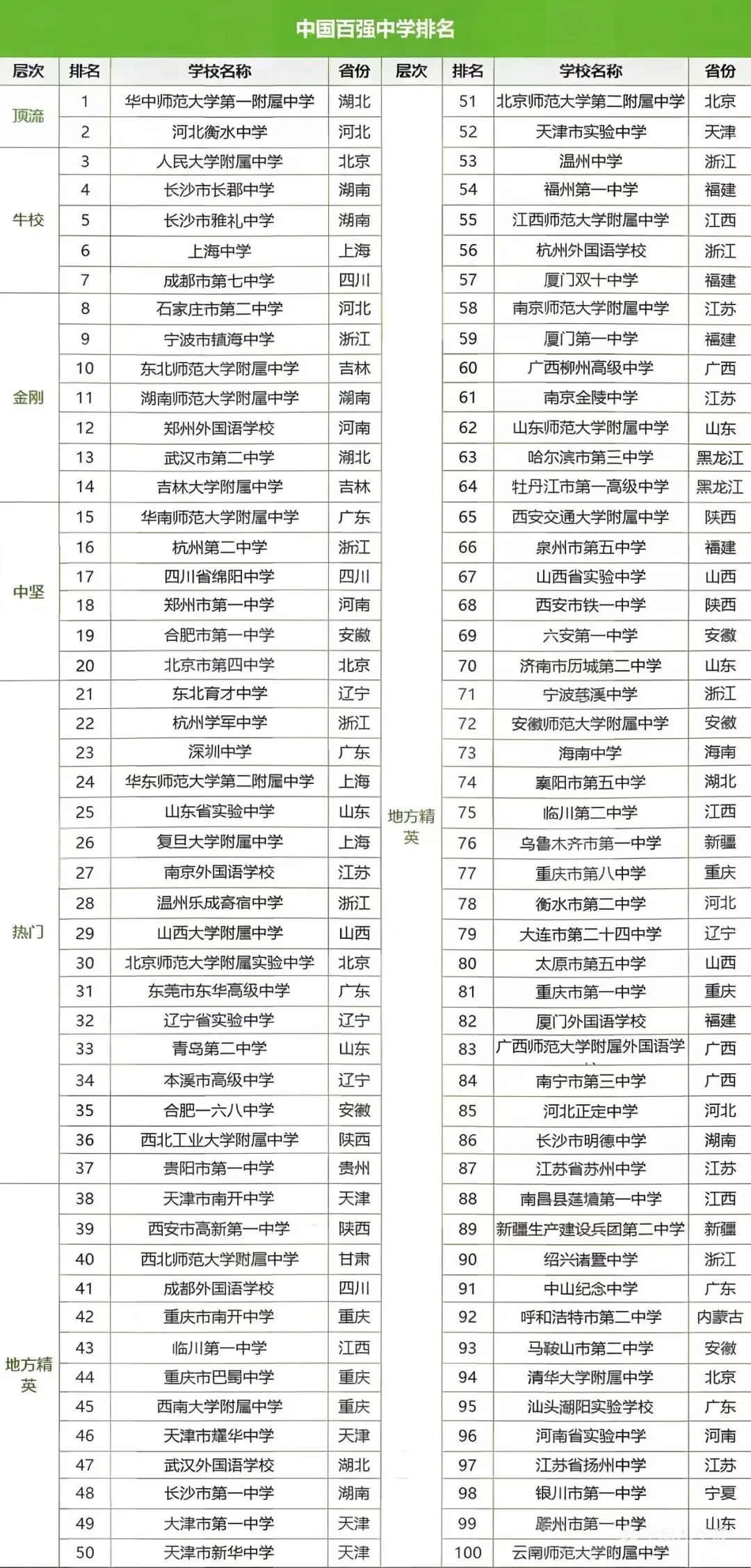 全国高中排名100强并没有一个官方统一的榜单,不同机构的评价标准会有所差异。以下是几个比较有参考价值的排名来源: