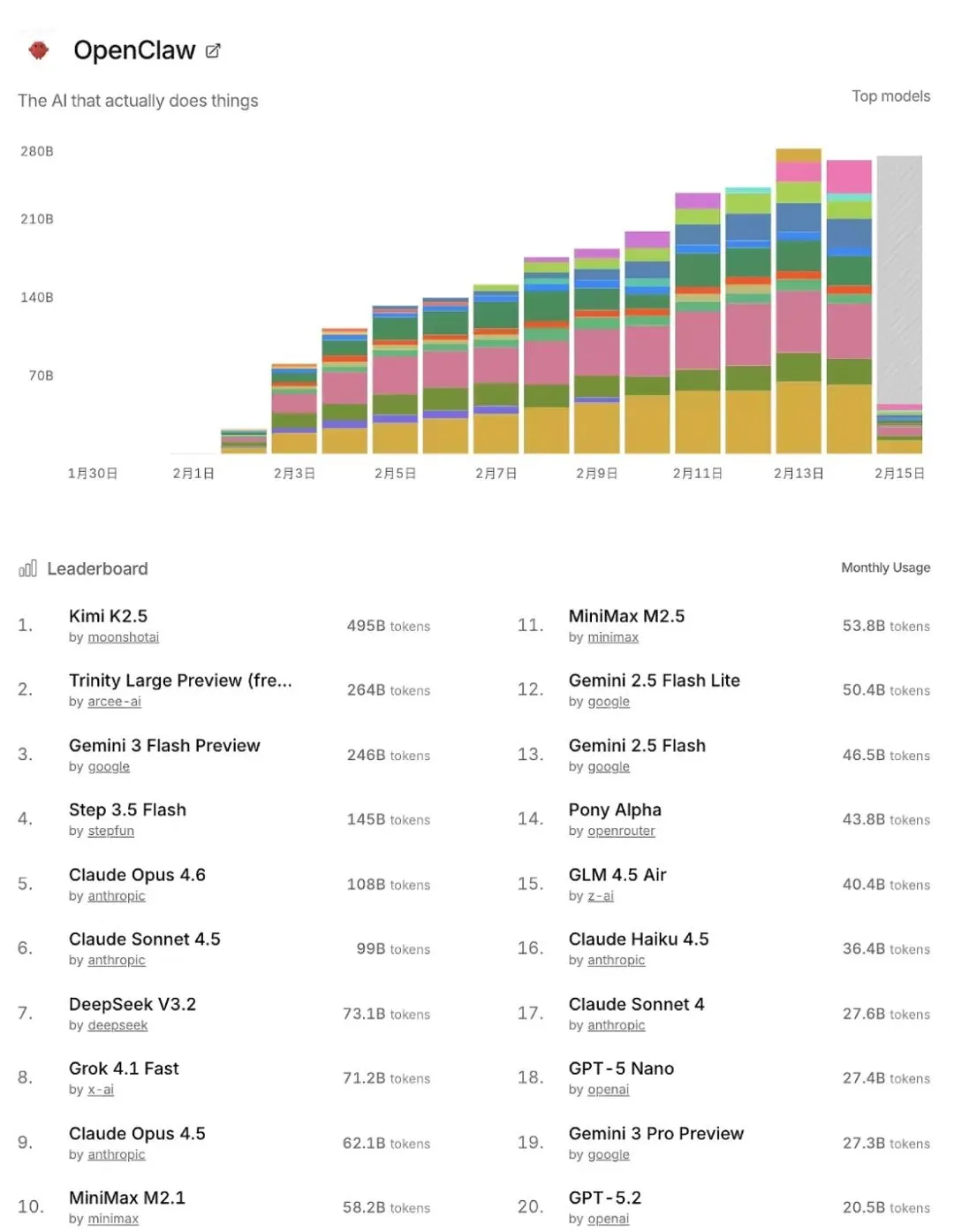 宝子们!OpenRouter 旗下主打「AI真干活」的 OpenClaw 最新月度 Token 用量榜新鲜出炉👀