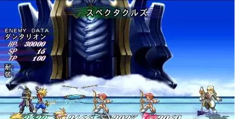 BOSS HP8W,没有特殊的弱点属性。推荐战术是让凯依路和朱达斯在前面牵制BOSS,不要让BOSS使用的风压破坏后防线的晶术咏唱,如果主角进入了灵魂爆裂状态了,请你毫不忧郁的使用秘奥义吧,这样能狂耗BOSS的HP,当然如果你能熟练的配合SP分与来使用秘奥义的话,那就再好不过。