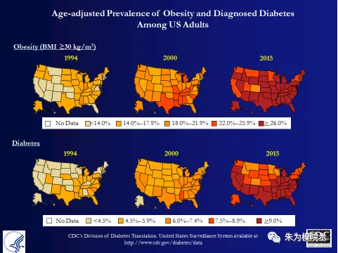 肥胖和糖尿病之间的关系早被研究所认识。以美国为例,肥胖率最高州的糖尿病发病率也一定是最高的。上图为美国各州在1994年,2000年和2015年的肥胖(以BMI,身高体重指数≥30计)发生率,下图为相应的糖尿病发病率。